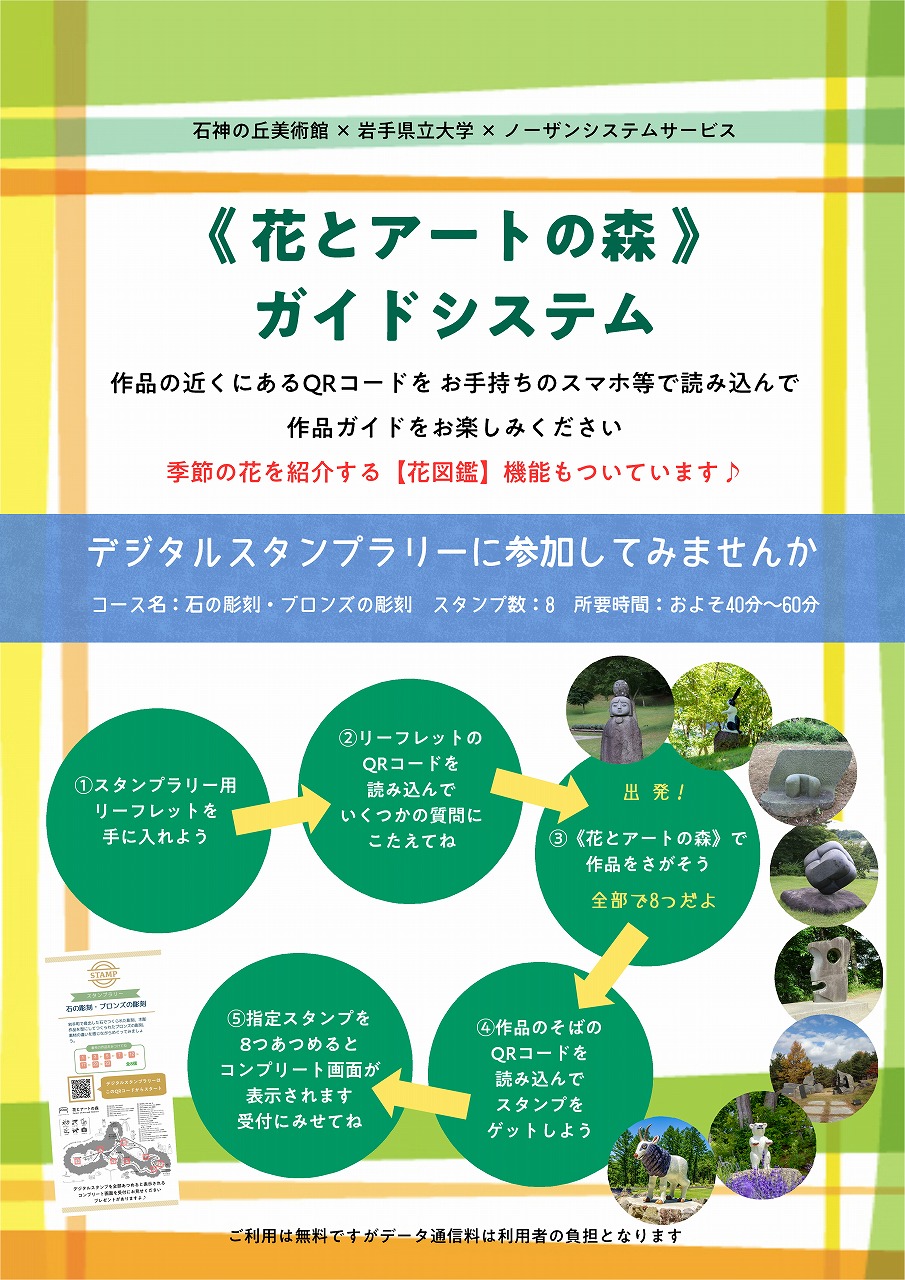 石神の丘美術館の野外エリア〈花とアートの森〉にある24点の作品ガイドを、お手持ちのスマホ等を用い楽しむことができます。