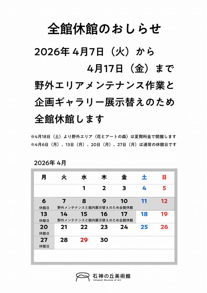石神の丘美術館は、2026年4月7日(火)から4月17日(金)まで、全館休館します。 この間、野外エリアはメンテナンス作業を行います。館内は展示替えを行います。