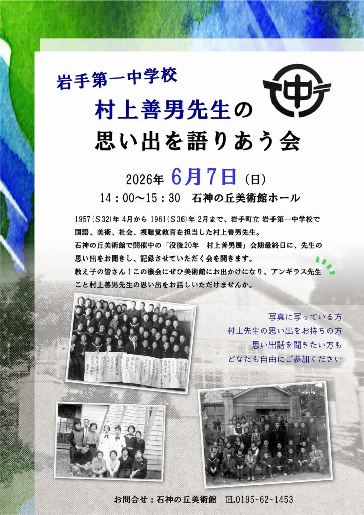 石神の丘美術館で開催中の「没後20年 村上善男展」会期最終日に、先生の思い出をお聞きし、記録させていただく会を開きます。